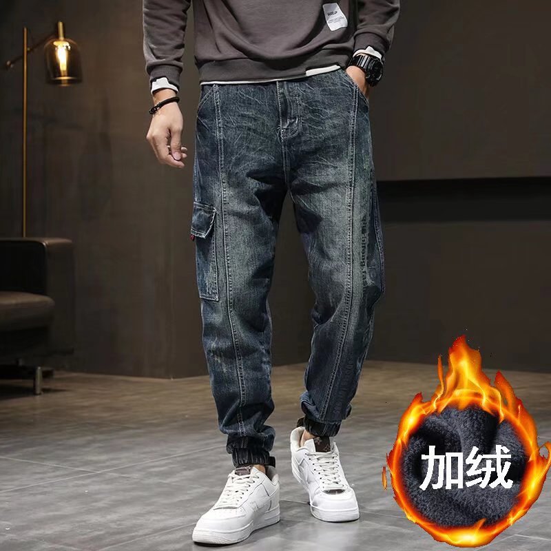 ジーンズ男秋冬とベルベットはゆったりした足のレトロな水洗い日系ファッションブランド冬ズボン保温ハーレムズボンを厚くした