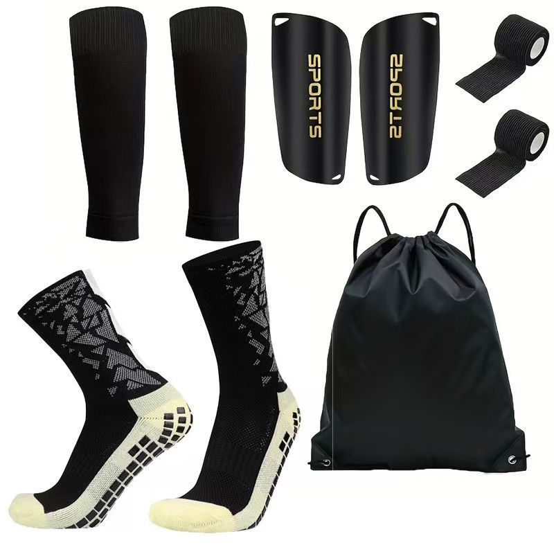 TEMU スポーツソックス、サッカーソックス、ミッドチューブドット滑り止めソックス、レガース、包帯巾着袋の5点セット