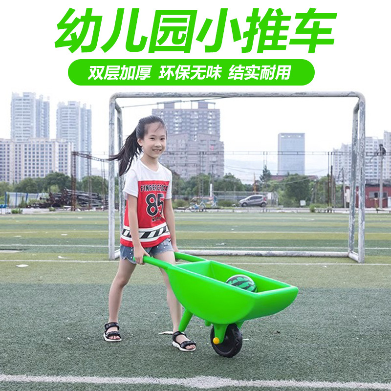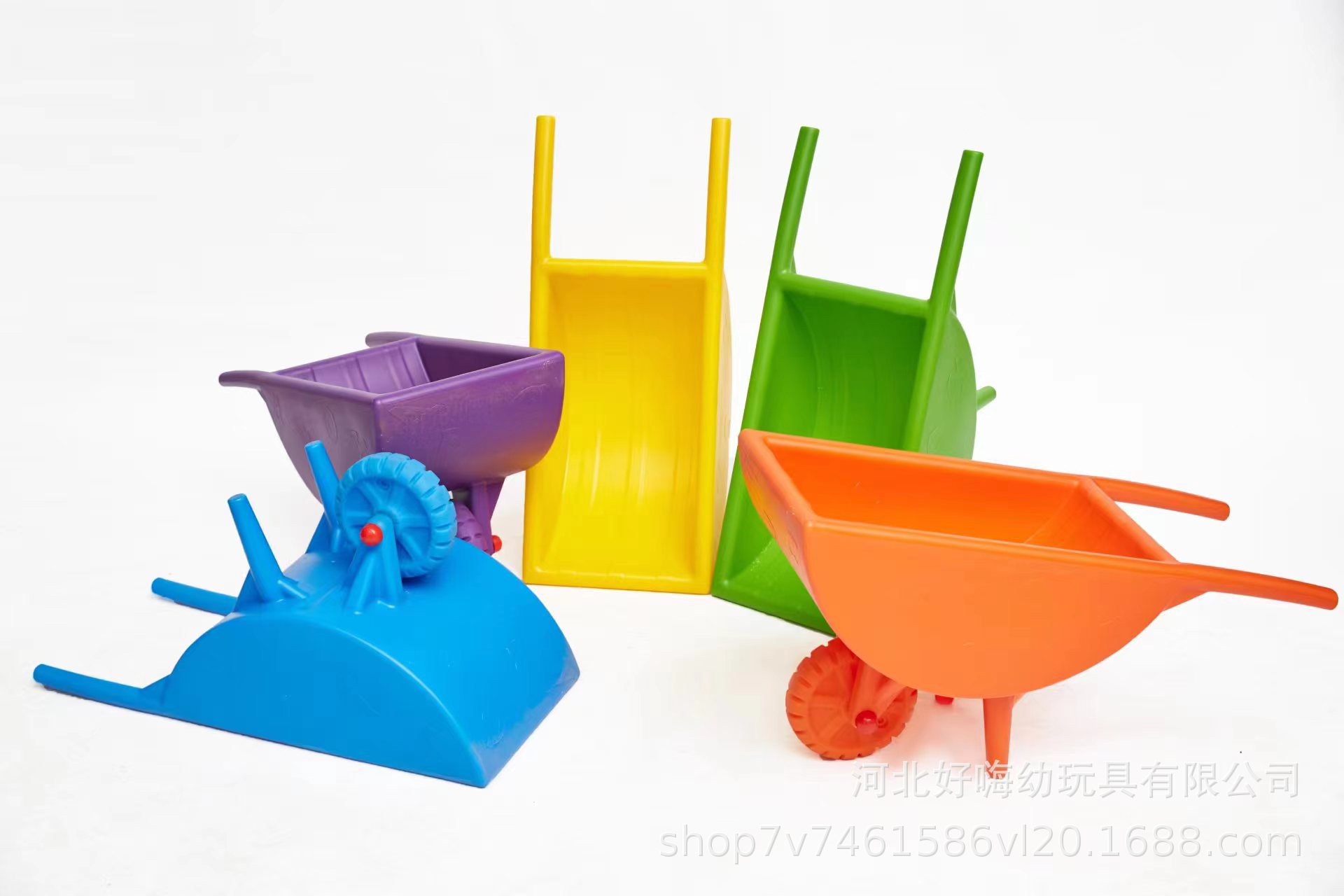 幼稚園の子供の屋外のおもちゃは手押し車をひっくり返します。