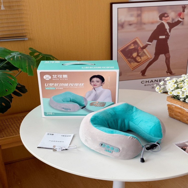艾克熊マッサージ枕u型枕保護頚椎枕USBマッサージ器記憶綿植毛布スローバック恒温加熱