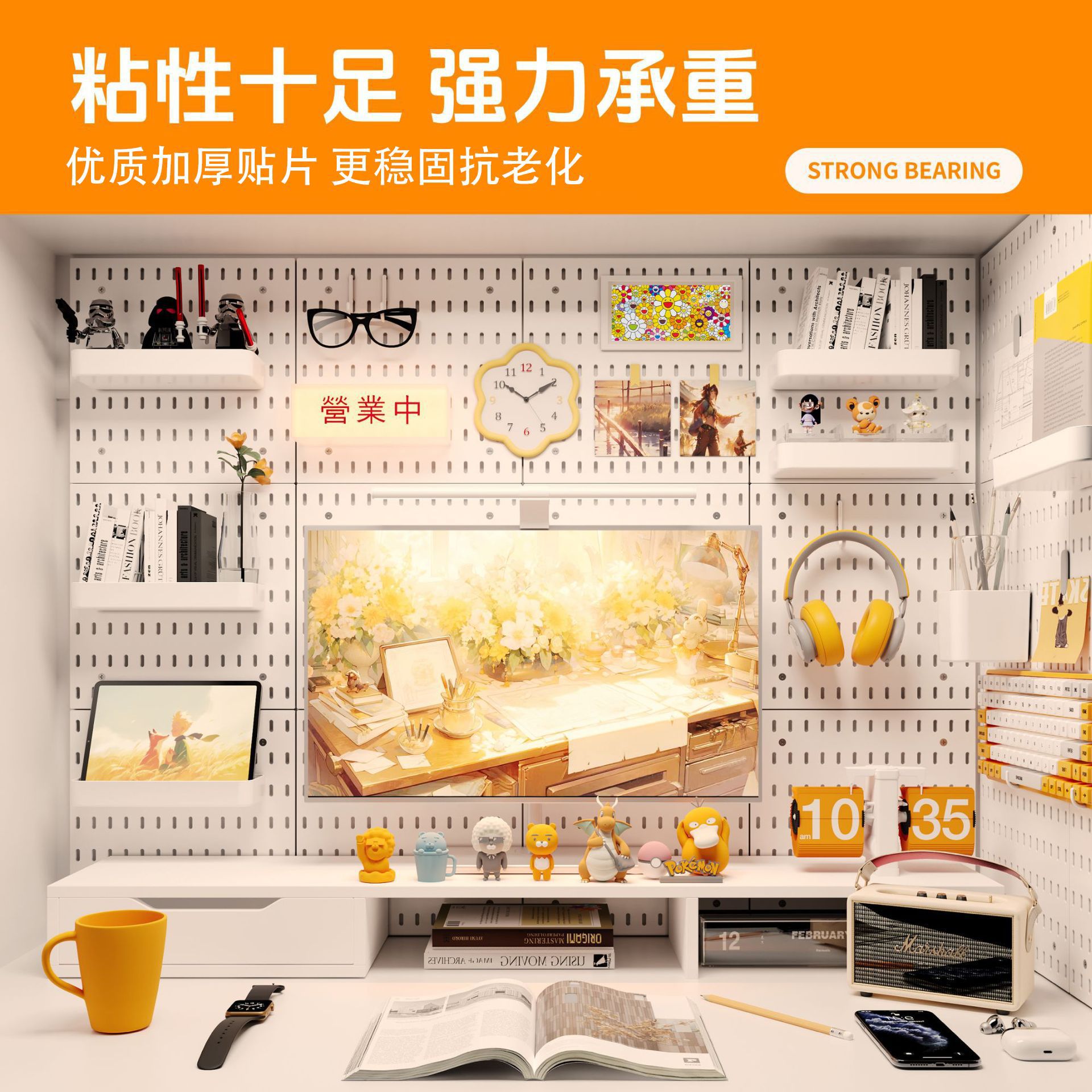 穴の板の部品は釘をつけないでフックして穴を開けないデスクトップの机を整理して神器を収納して穴の板を配合します。