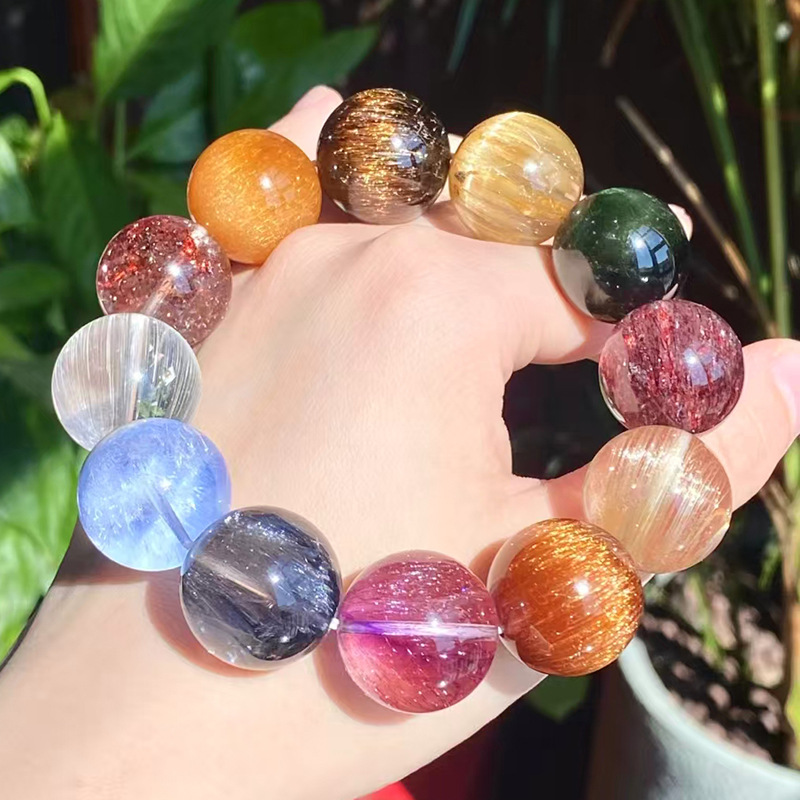 天然ブロンドクリスタルウサギの毛グリーンゴーストホワイトクリスタルレッドグルーフラワーイエロータワークリスタルアクアマリンアメジストマルチサークルブレスレットロット