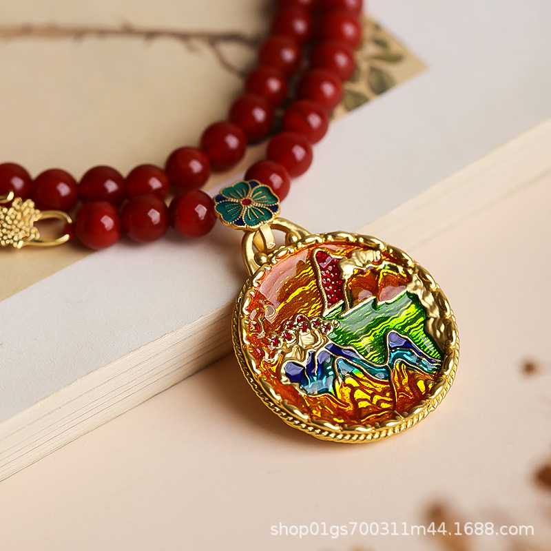ファッションレトロ模造南赤瑪瑙ラウンドビーズネックレス女性古法沙金千里江山ペンダント宮廷質製エナメル