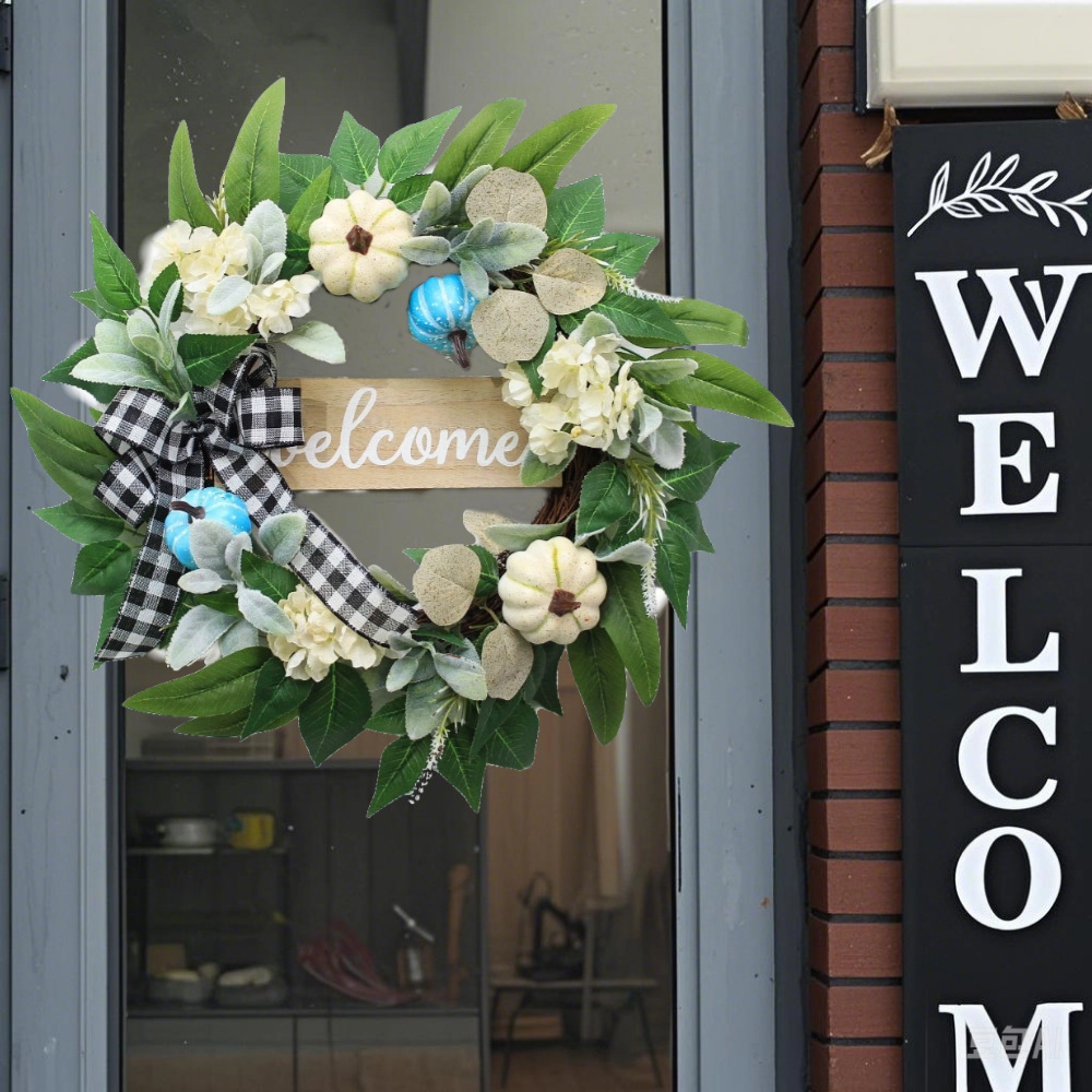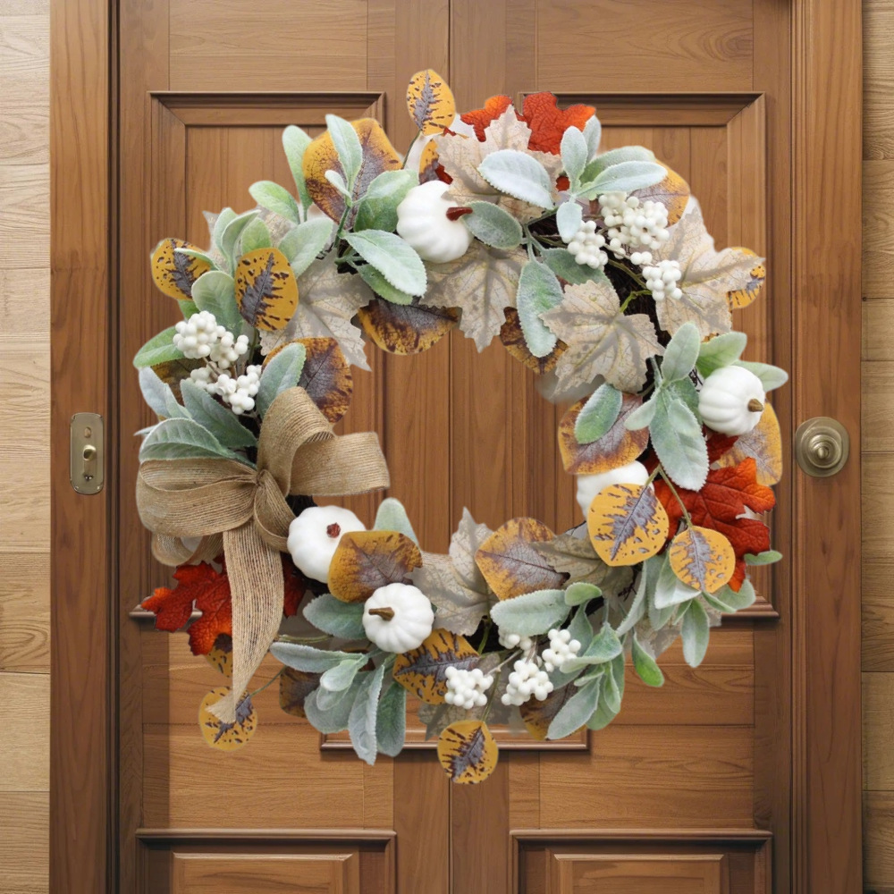 50cm 模擬ユーカリの葉 ホワイトパンプキン 秋のガーランド 玄関ドア ファームハウス ウェルカムサイン ハンギングデコレーション用
