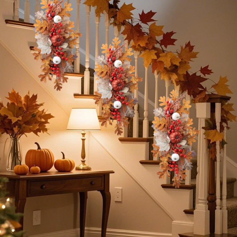秋の雰囲気が満載!模擬カエデの葉カボチャ装飾ガーランド、玄関窓のホリデーデコレーションの必需品