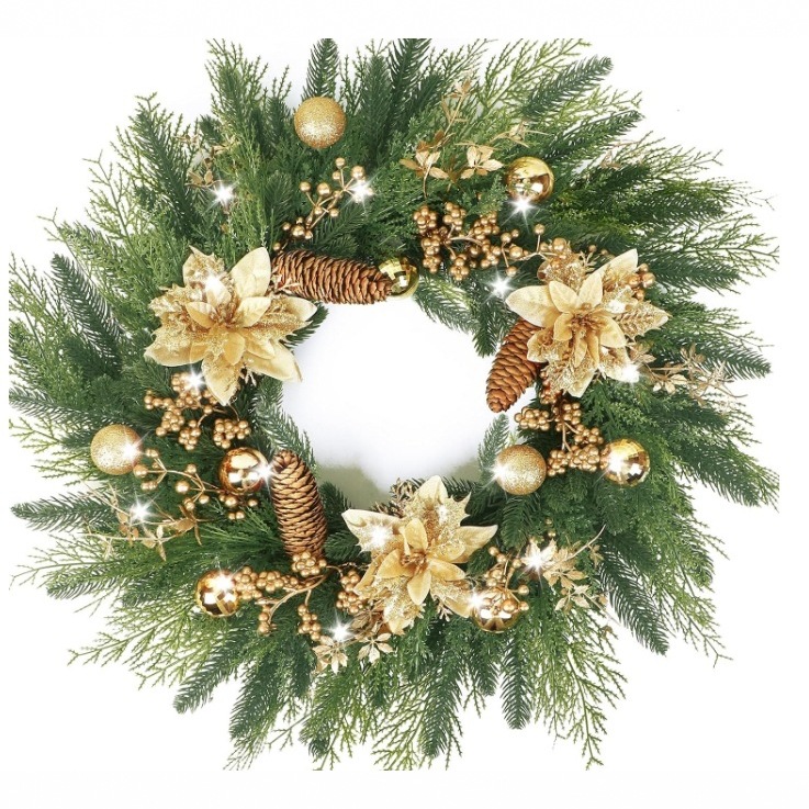 フロントドア用クリスマスリース、ライト付きクリスマスリース、ゴールデンフラワーベリーリーフボール、キラキラリース装飾