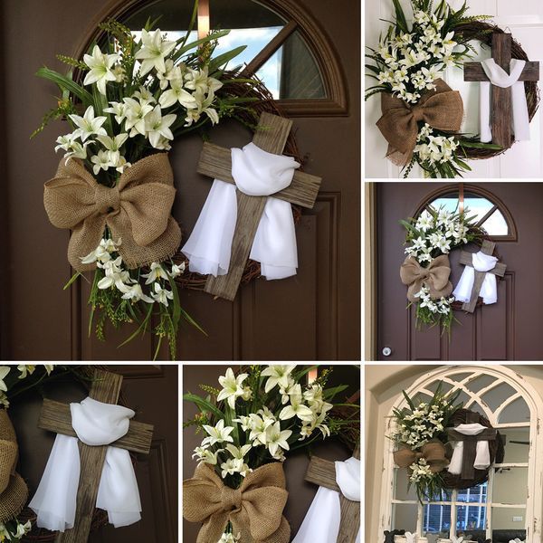 クロスボーダーEaster Wreath withクロスイースター十字架花輪門掛け装飾プラスチック花