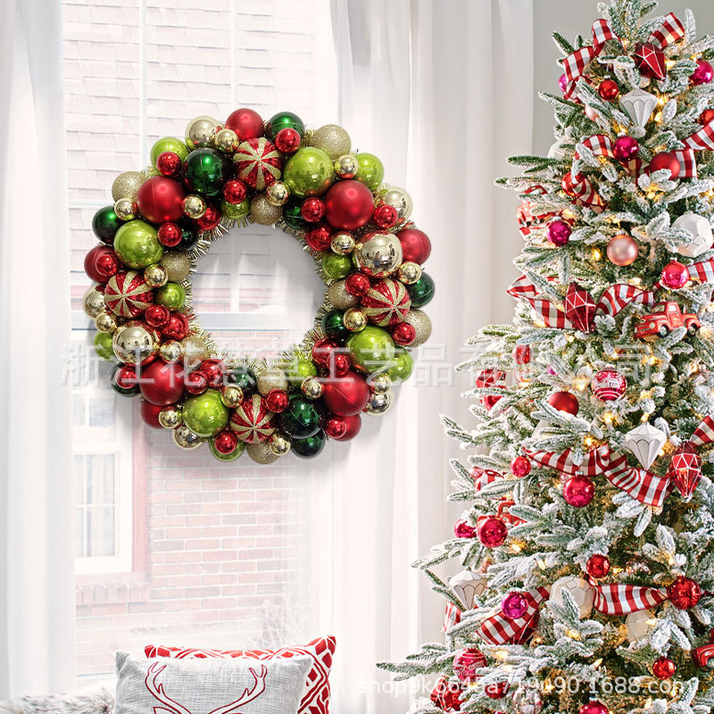 新しい2023クリスマスカラーボールの花輪が国境を越えて人気のある丸いクリスマスのショーウインドーの前のドアに家の工芸品を飾る