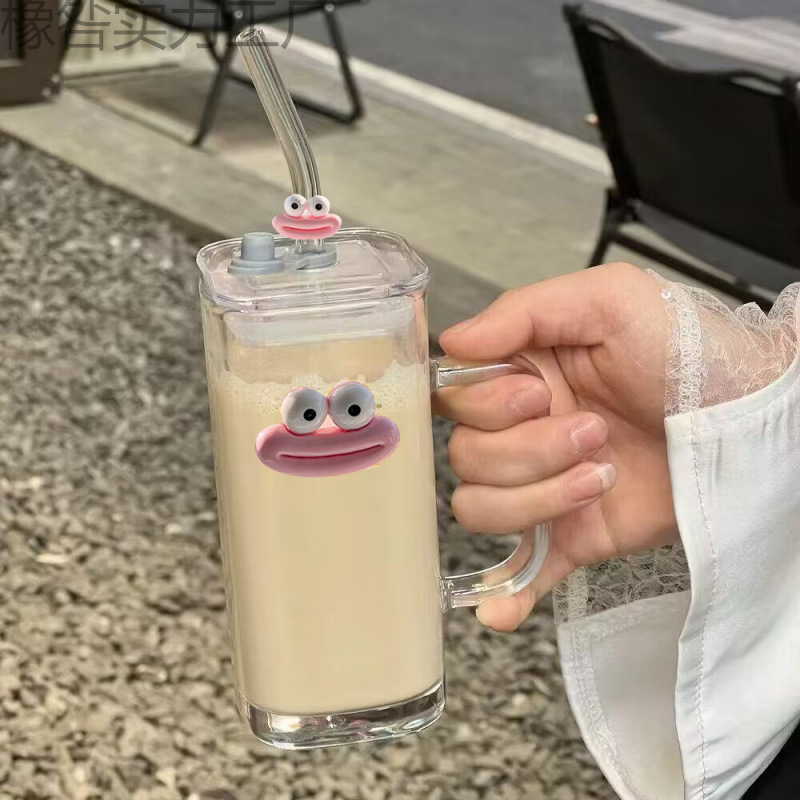 新学期クリエイティブソーセージ口スクエアガラスインカップストローハンドル高価値コーヒーカップ女性ウォーターカップ