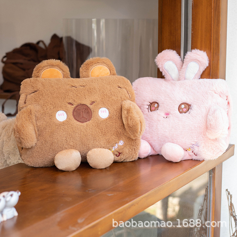 カピバラのカピバラの暖かい手は枕の湯たんぽのぬいぐるみの動物の冬の灌水の注水袋を抱いています。
