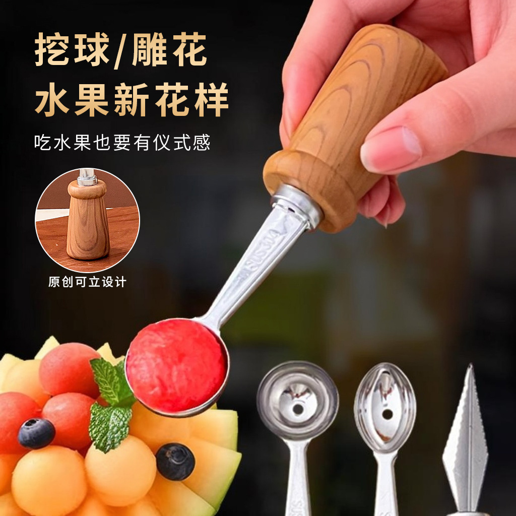 模造木製ハンドルフルーツボールスクープツーインワン双頭フルーツプラッターミートスクープクリエイティブ波形彫刻ナイフセット