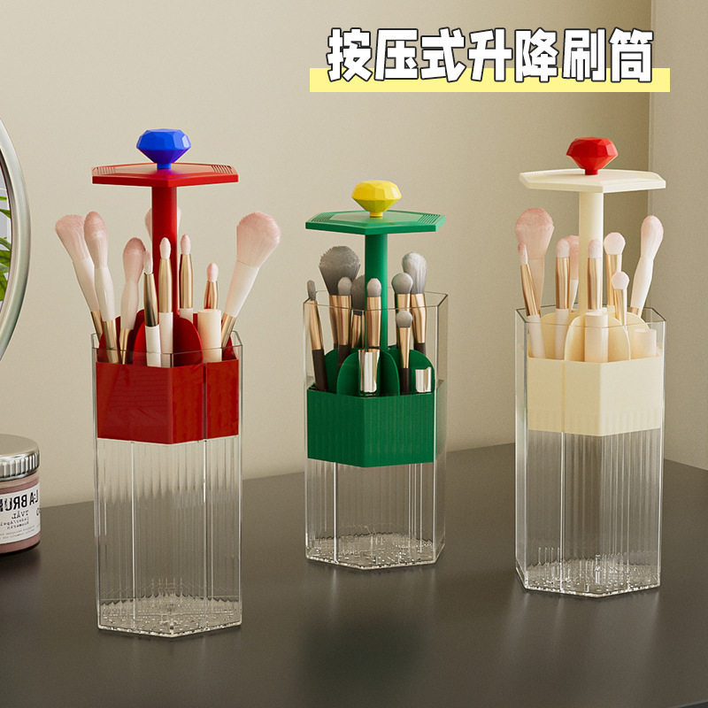 プレス式メイクブラシ収納チューブ 防塵 ドレッシングテーブル デスクトップ 化粧品収納ボックス 眉ペンシル ブラシ 自動昇降チューブ