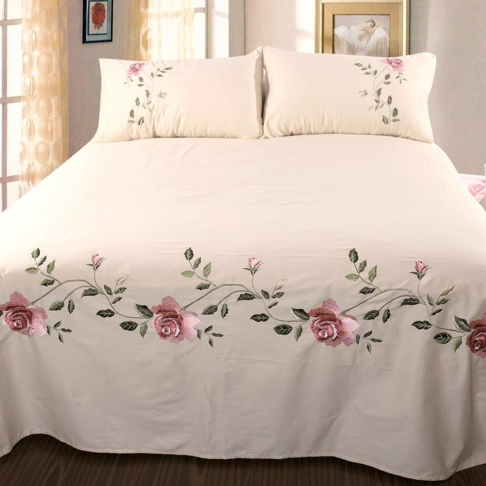 純綿刺繍ベッドシーツ3点セット ローズ柄 白 ピンク シングル/ダブル 刺繍ベッドシーツ 枕カバー