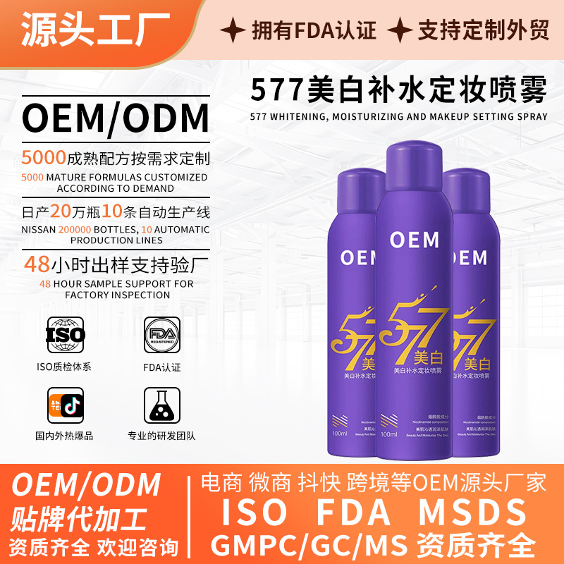 OEM 長期持続美白、保湿、そばかす防止メイクアップセッティングスプレー、カスタマイズされた非除去メイクアップ、高速膜形成 577 メイクアップセッティングスプレー