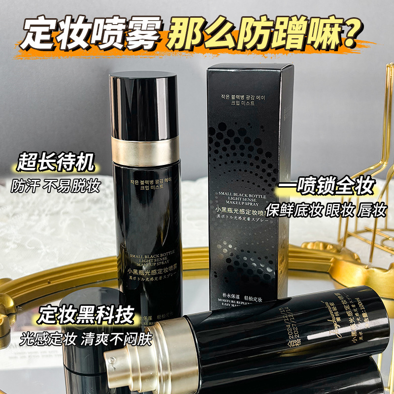 Douyinと同じスタイルの小さな黒いボトルのライトセンシングメイクアップスプレー、メイク前、長持ち、落ちないメイクアップスプレー、素早く膜を形成します。