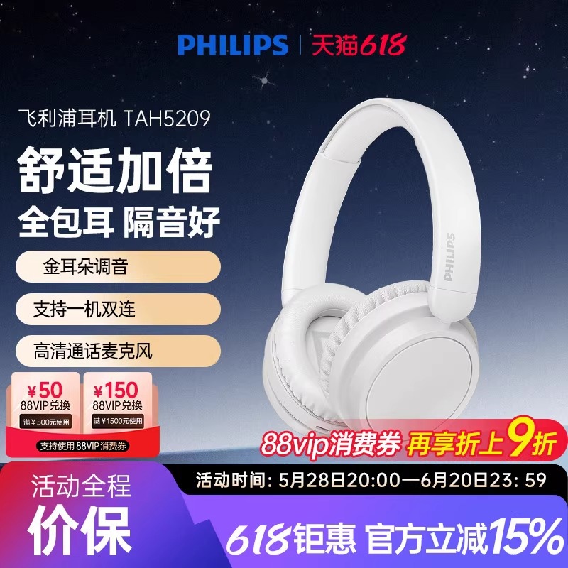 フィリップス TAH5209 ヘッドマウント ワイヤレス Bluetooth ヘッドセット、長いバッテリー寿命、高解像度通話、ノイズリダクション、折りたたみ式耳保護タイプ