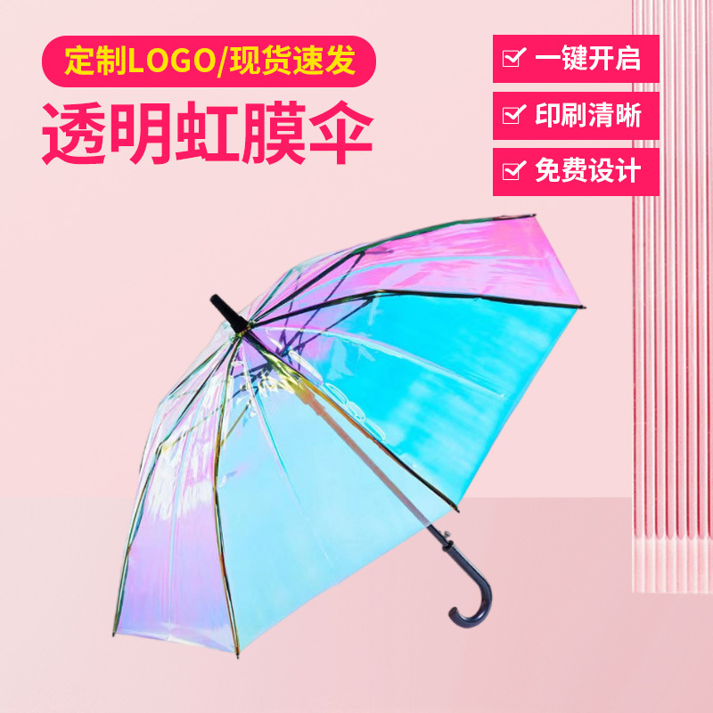 卸売りの新型のまぶしいまっすぐな竿の透明な傘の厚いレーザーの透明な傘のカラーフィルムの自動長い柄の広告の傘