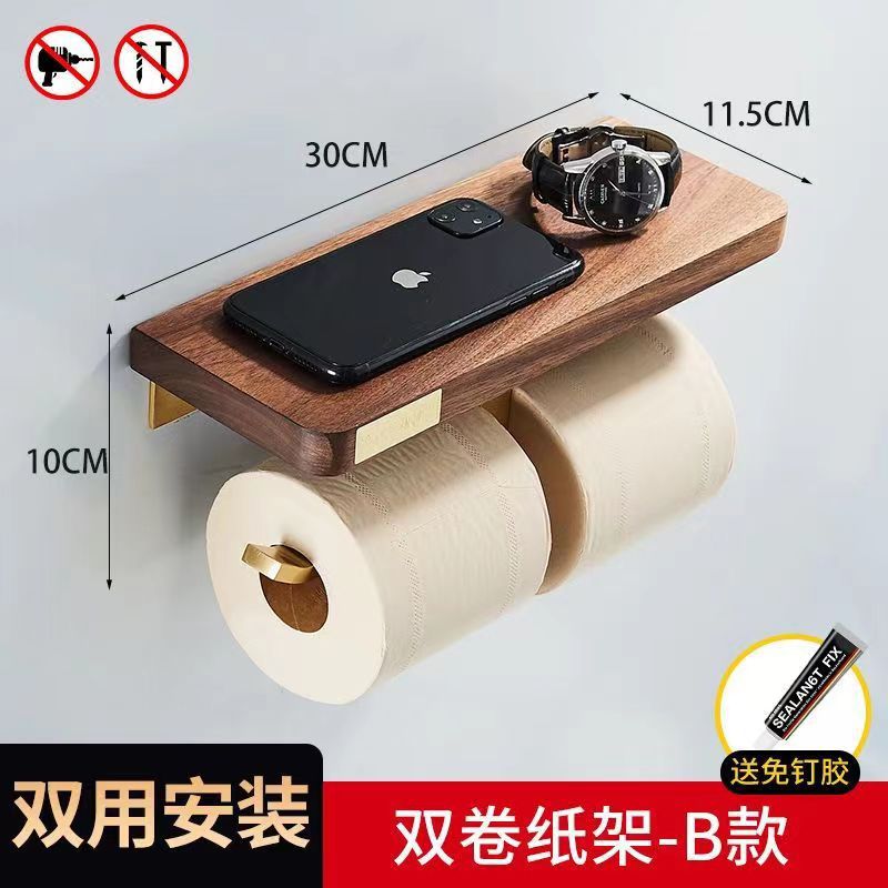 胡桃木ティッシュ棚金色トイレ穴なしトイレットペーパー棚実木ロール紙棚携帯電話壁掛け穴なし
