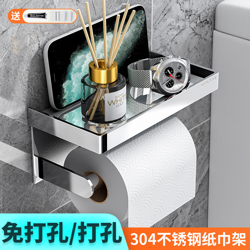 厚手304ステンレスロールホルダートイレ穴なしティッシュケース物置きトイレトイレットペーパー携帯電話ホルダー