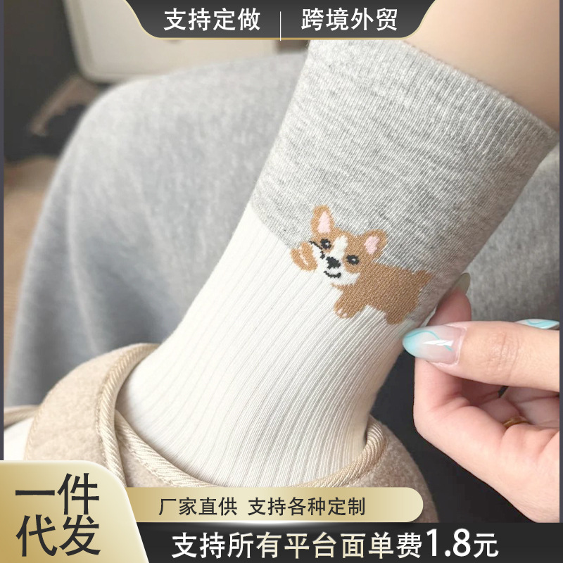 ハキミの色合わせの靴下春夏韓国版の女性の中筒の漫画の子犬の中筒のかわいい百合insは長い靴下を積み上げます。