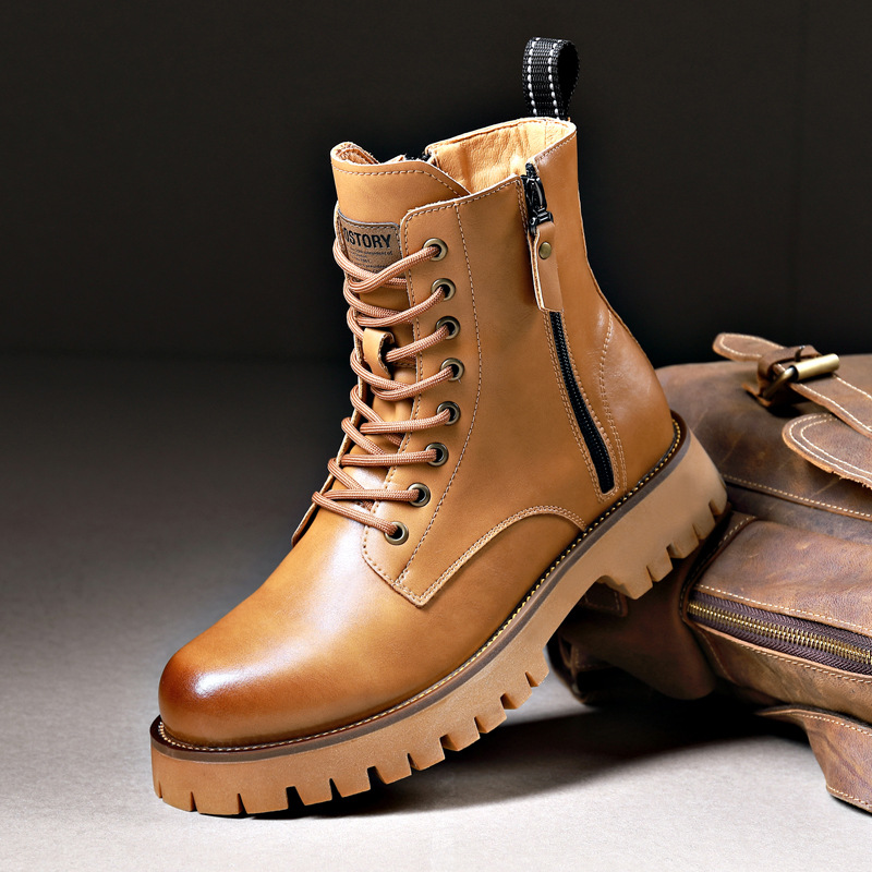 秋冬の本革の大黄の靴は厚い底の軽やかなマーティンの靴のカジュアルで快適な側のファスナーの丸い頭の工装の男性の靴を手伝います。