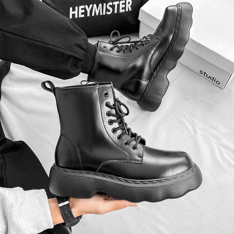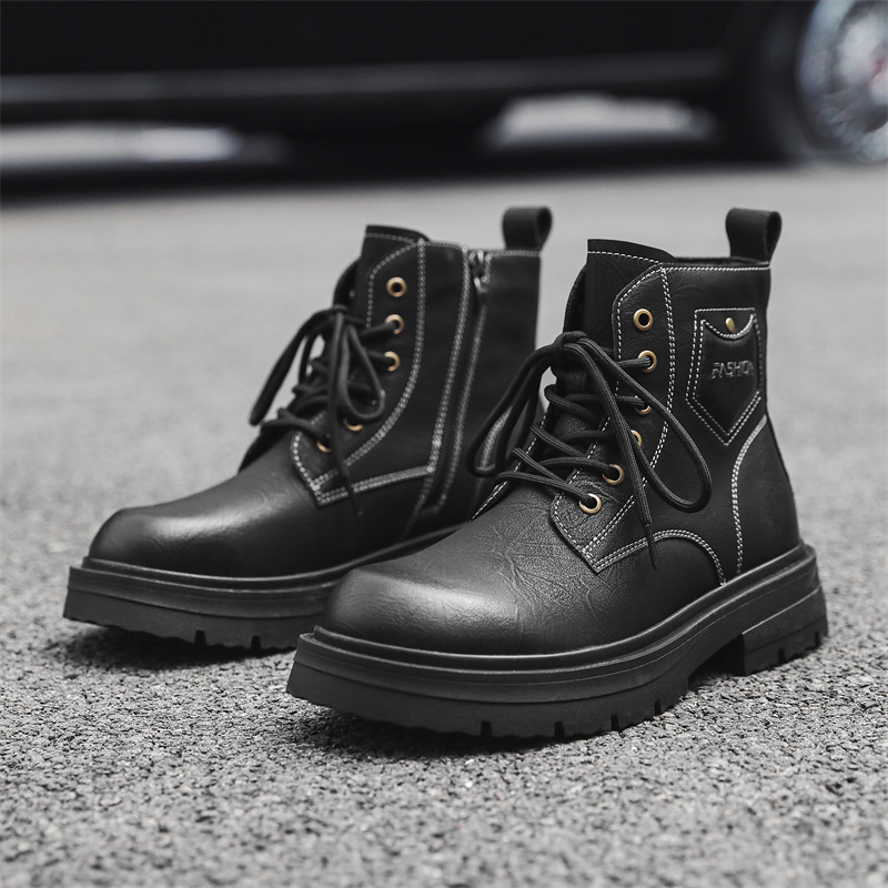 英倫風黒マーティンブーツ男insクール側ファスナー工装機関車靴欧米の厚い底の高い靴-R