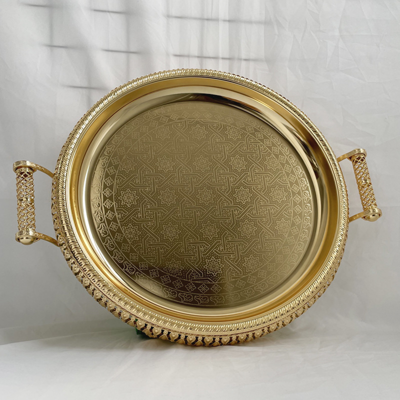现货45CM摩洛哥托盘阿拉伯刻花镀金服务盘Metal Serving Tray
