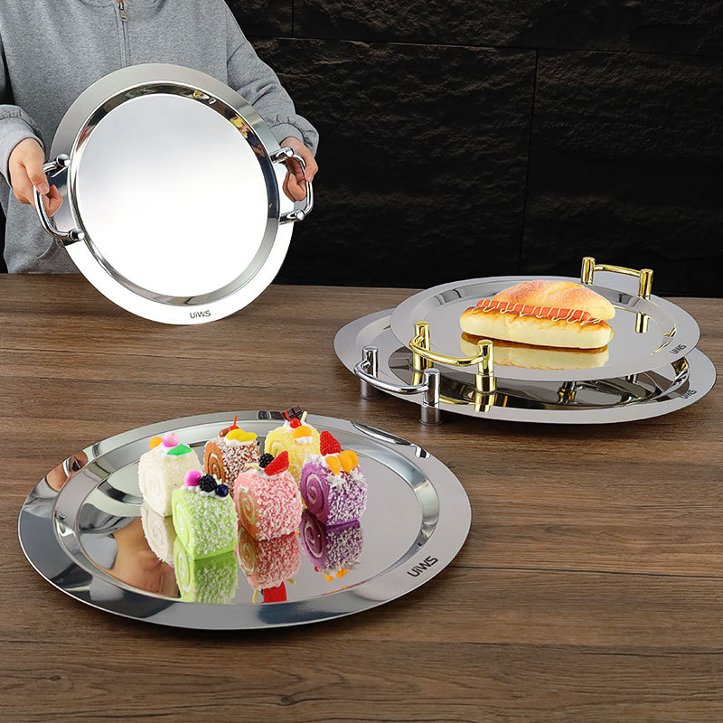 国境を越えたステンレス円形鏡盤レストランホテルバイキング果物盤両耳北欧金メッキトレイ