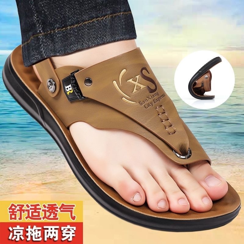 男性靴2024新型糞感男性一字スリッパの厚い底の外に靴を履いて耐摩耗性ビーチサンダルを履いている
