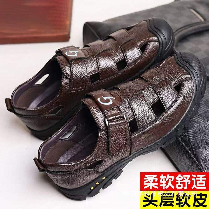 夏の新型男性の頭層牛革包頭サンダルアウトドアカジュアル本革ビーチ靴男の通気性の厚い底のスリッパ
