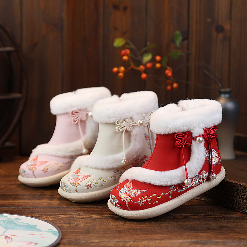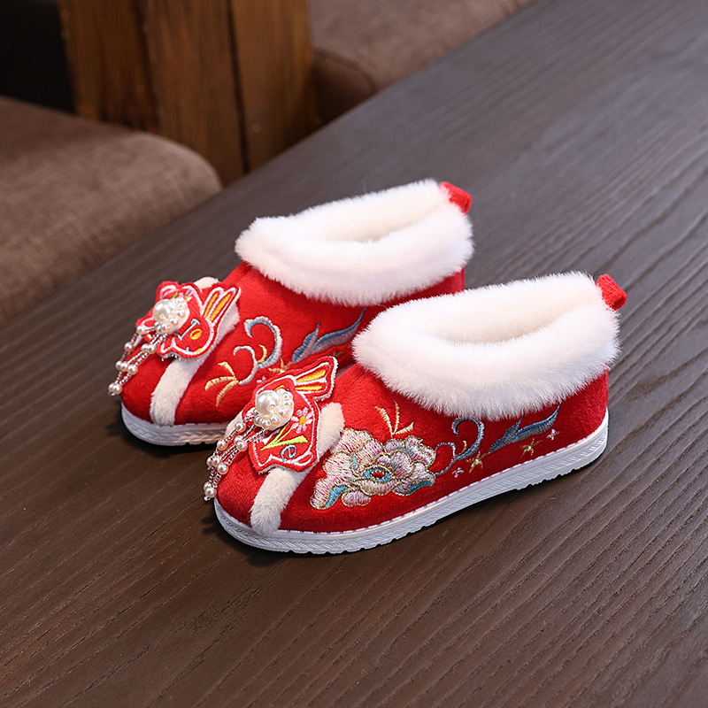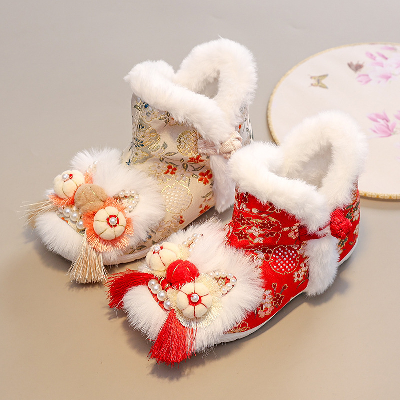 冬の新作子供用裏起毛厚手綿靴漢服靴ベビー綿ブーツ女の子中国風刺繍靴お年賀靴