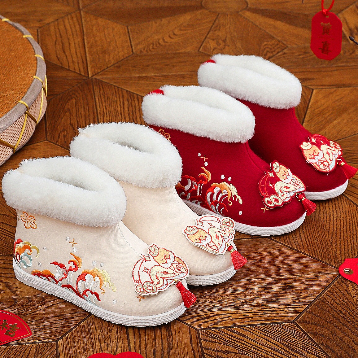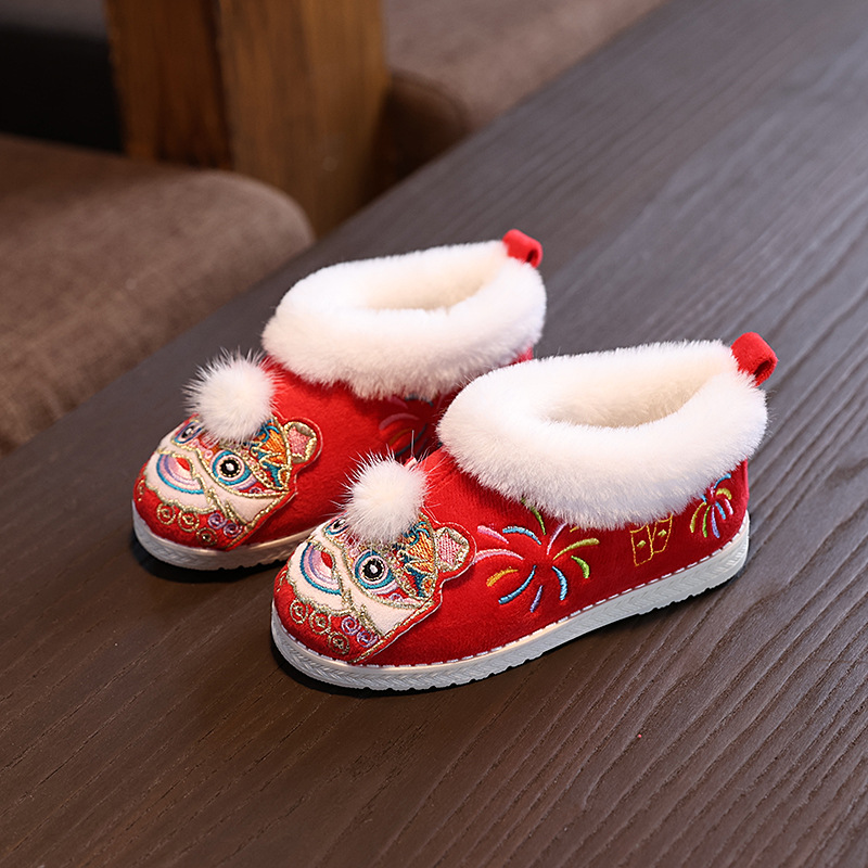 虎頭靴 女の子用 漢服靴 子供用 古風ブーツ 赤ちゃん用 昔ながらの正月綿靴 冬用 裏起毛 手作り