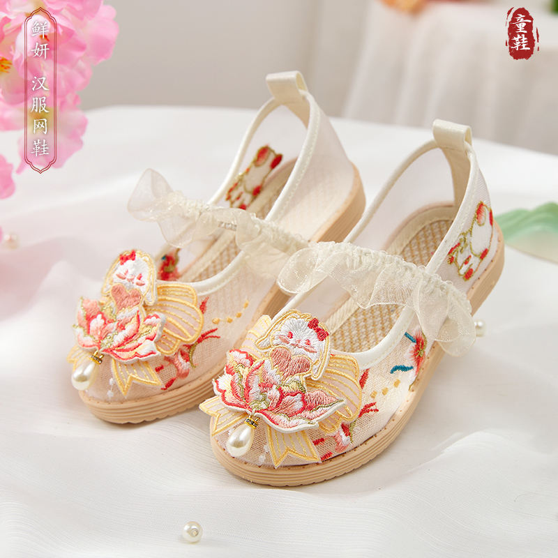 女の子の漢服靴2024新型子供の馬のスカートの国風の時代の女性の赤ちゃんの刺繍の靴の民族の風ネットの靴
