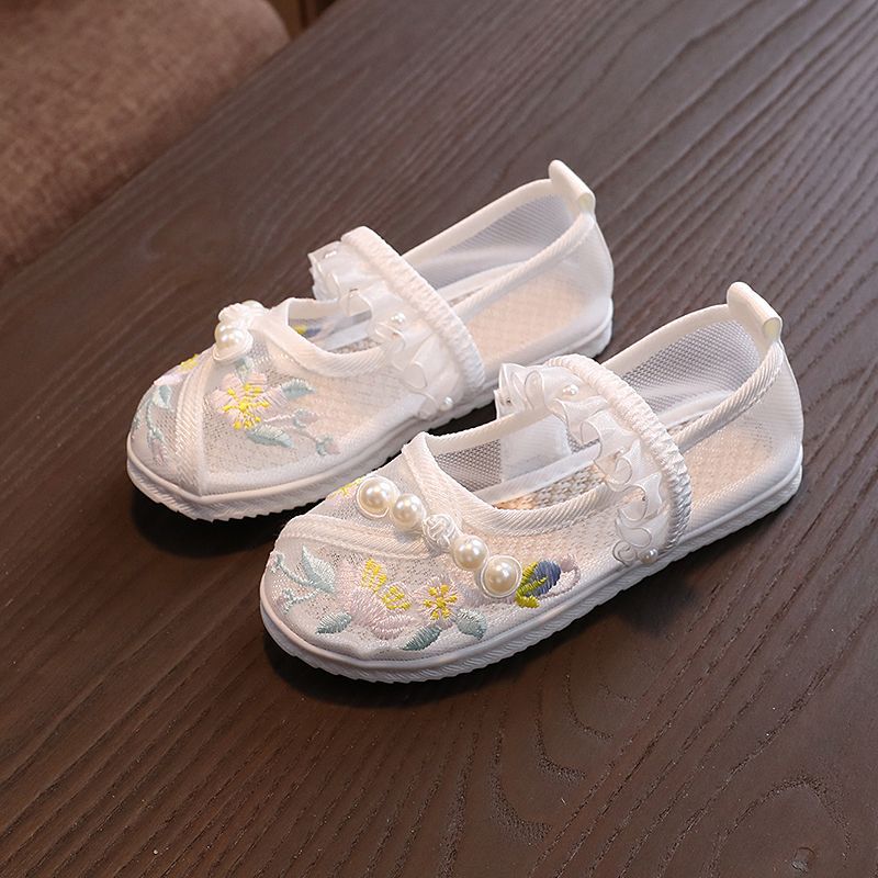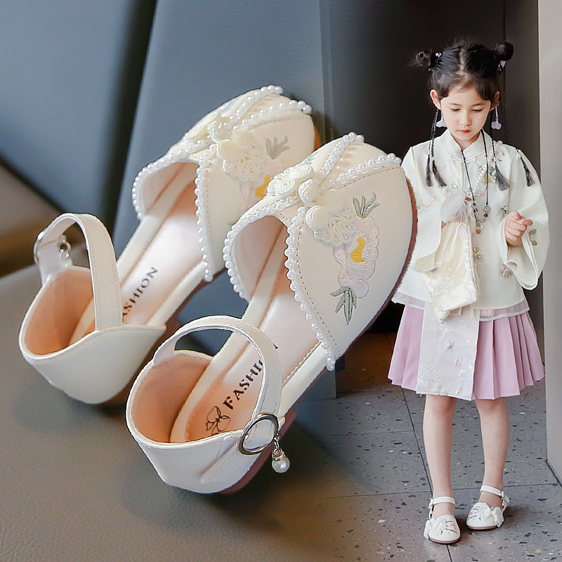 女の子の漢服靴2024新型夏の子供と馬のスカートの靴のサンダルの女性の宝の国風の刺繍の靴の古風
