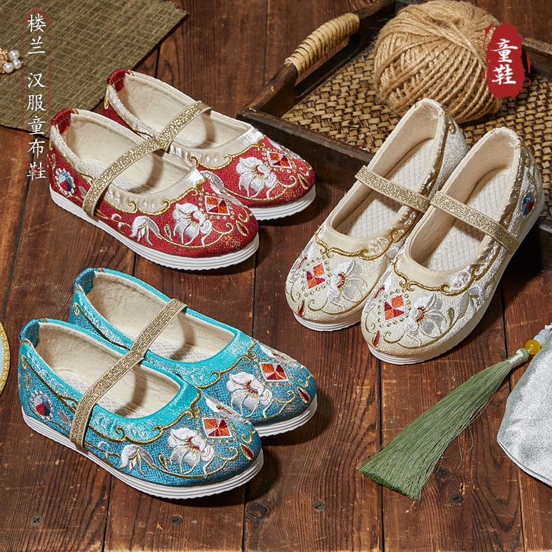 女の子の漢服の靴の子供の布の靴の楼蘭の王女の時代の服装は刺繍の靴の伝統の刺繍の靴の復古の古風の靴を演じます。