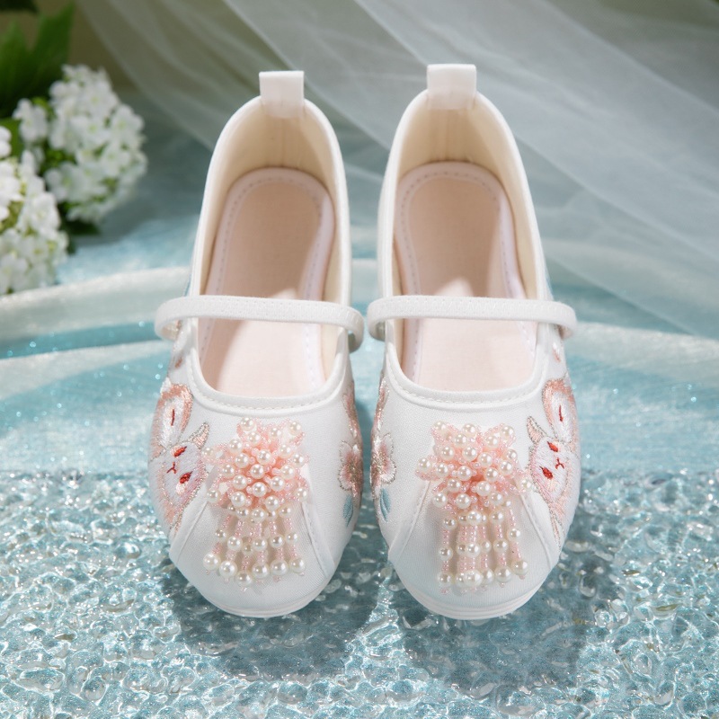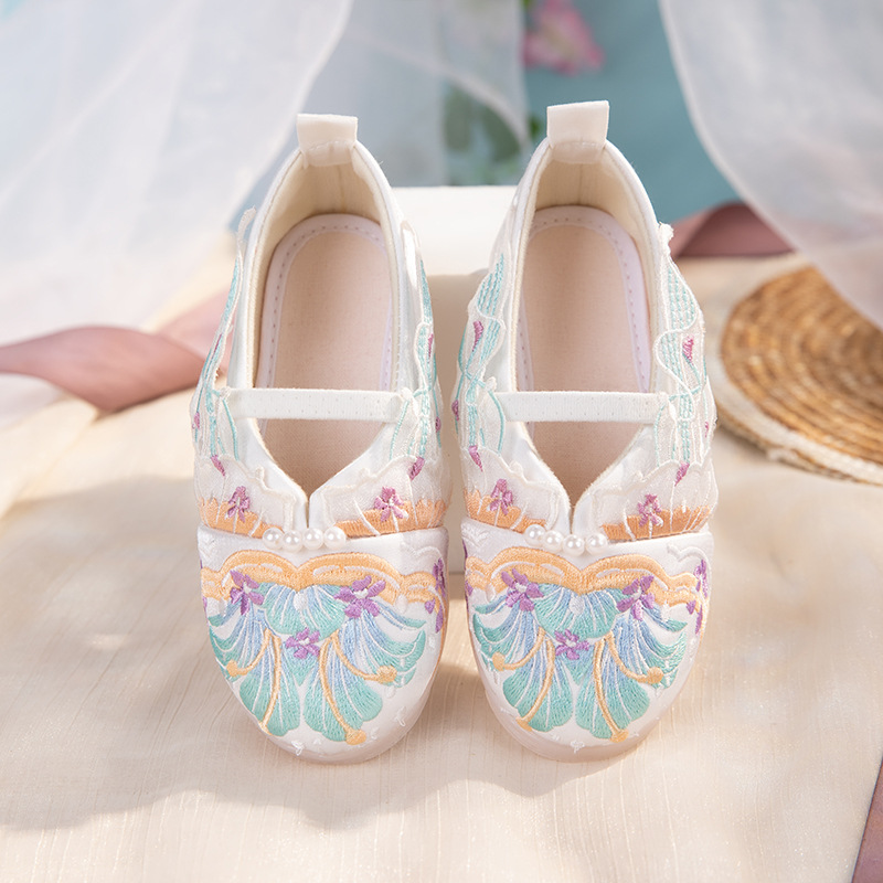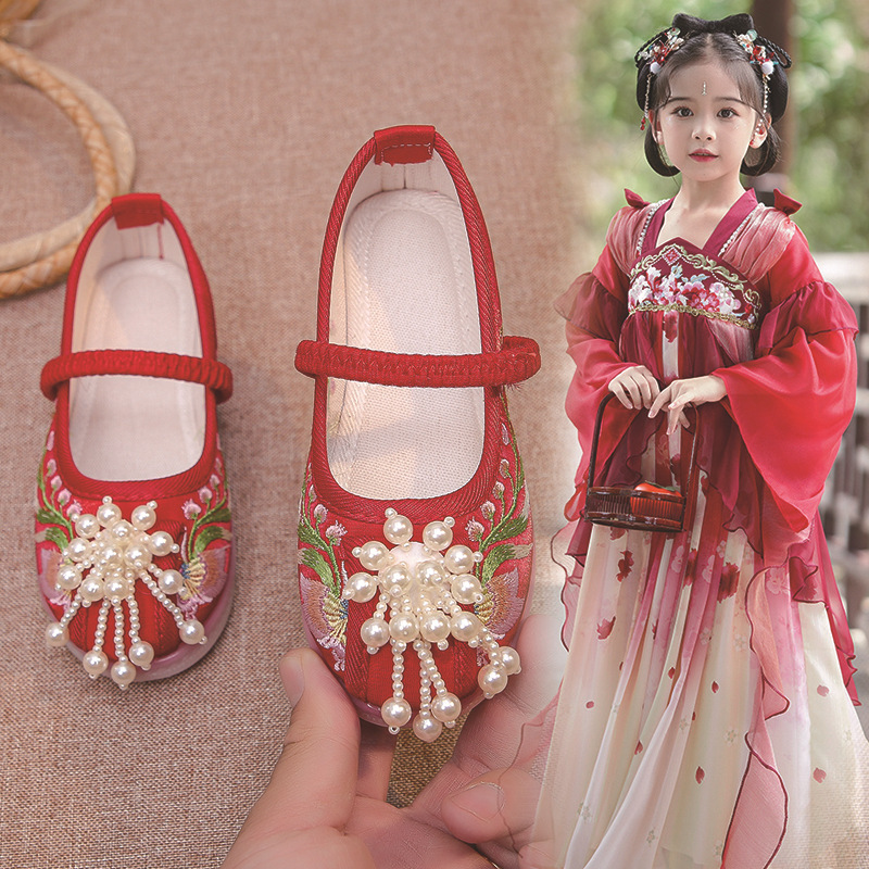 中国風の子供の布の靴は時代の靴の中で大きい子供の刺繍の靴の女の子の漢服の靴の真珠は古風の靴を緩めます。