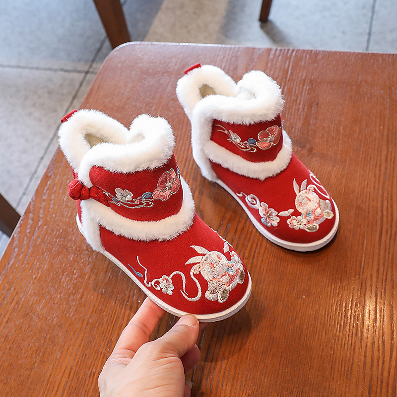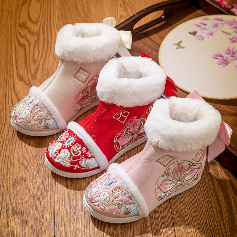 冬の女の子とベルベットの漢服靴中国風古風綿靴子供の厚い刺繍靴赤ちゃん保温雪地靴