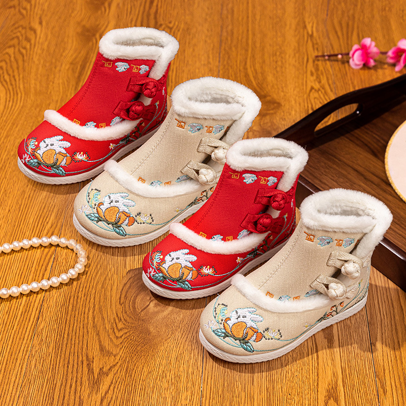 漢服の靴の女の子の冬のベルベットの漢服のブーツの時代の国風の子供の刺繍の靴の赤ちゃんの古風の新年の靴