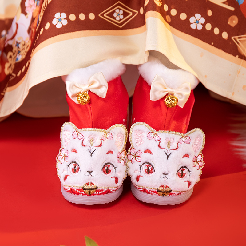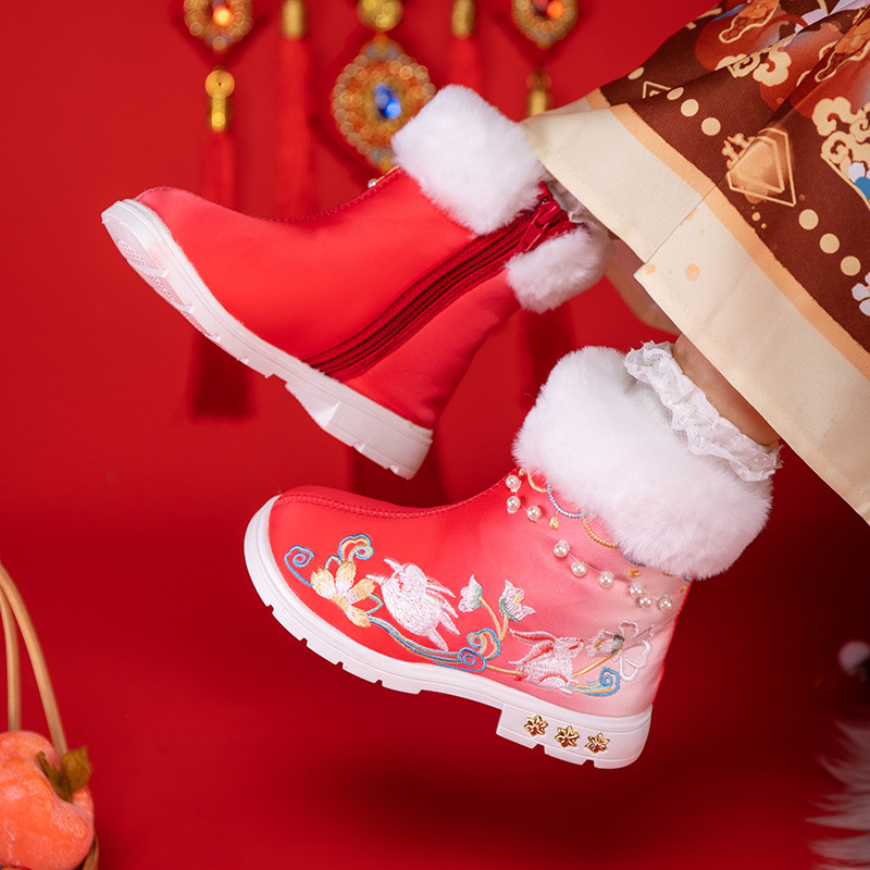 沐花卉2023冬の新型漢服靴中国風拝年靴児童綿靴古着民族風刺繍靴