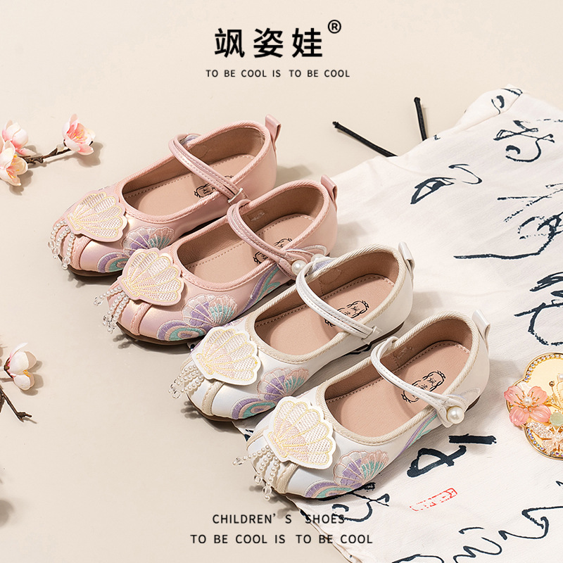 女の子の漢服の靴2024春の新型のダンスの靴の滑り止めのファッションの小さい子供は足の柔らかい底をかぶせて靴のファッションを掛けます。