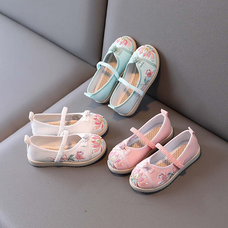 子供の水蓉花刺繍の女の子の刺繍の靴の通気性の時代の漢服の靴のチャイナドレスの靴の柔らかい底の布の靴