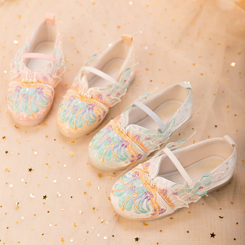 子供用馬面裙シューズ、女の子用刺繍靴、中国風中空漢服靴、旗袍靴、新中式通気性メッシュシューズ