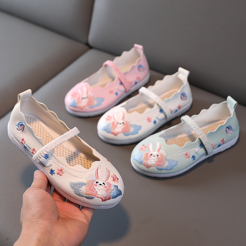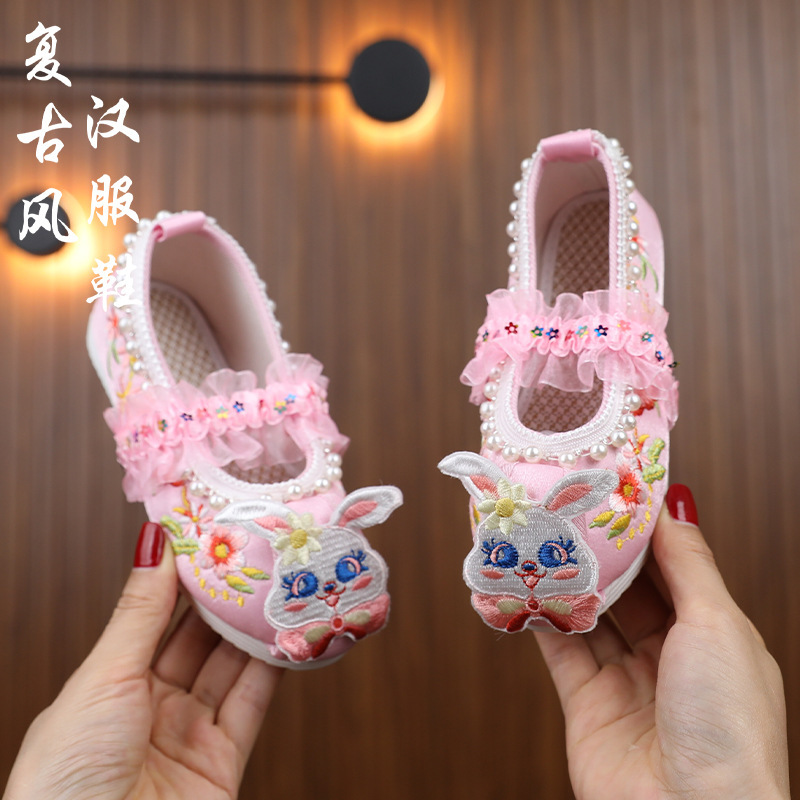 漢服の靴の女の子の春の新型のウサギの靴の中国風の時代の赤ちゃんの刺繍の靴の古い北京の子供の布の靴