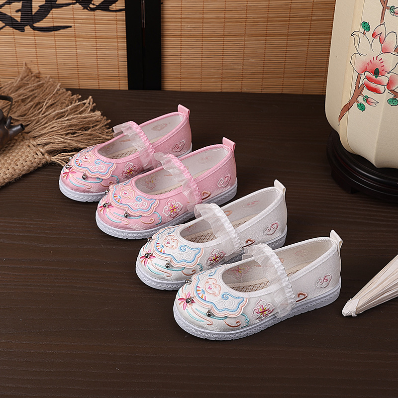 新しい女の子用刺繍靴、レトロな馬面靴、民族風漢服靴、通気性のあるネット靴、子供用靴、パフォーマンスシューズ