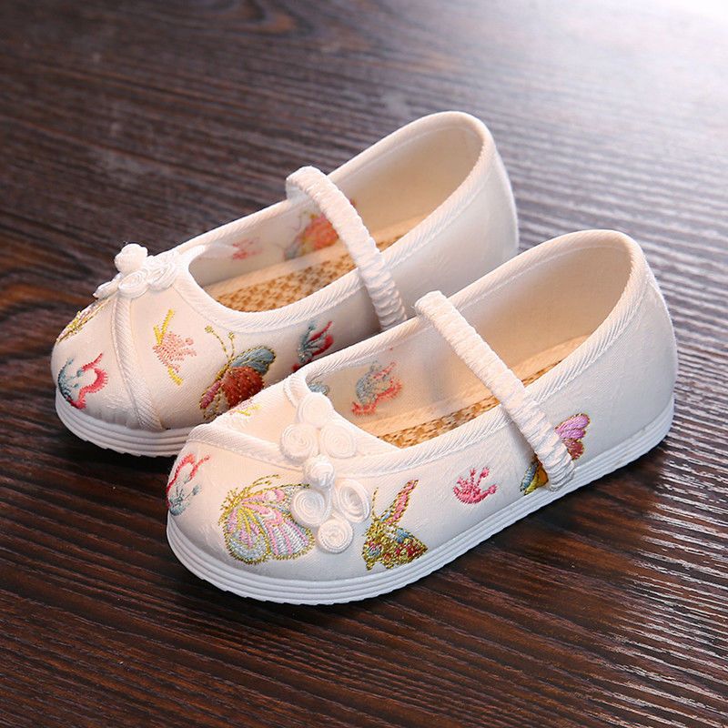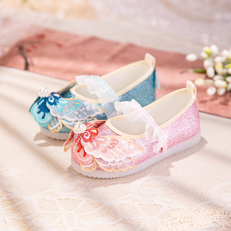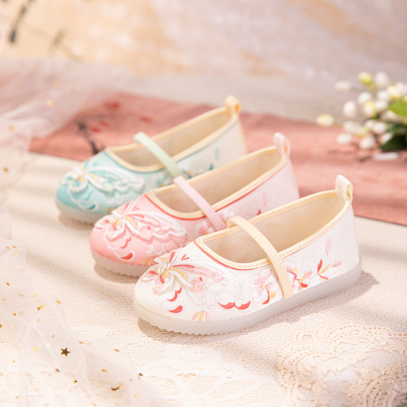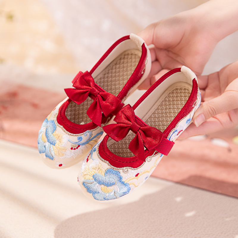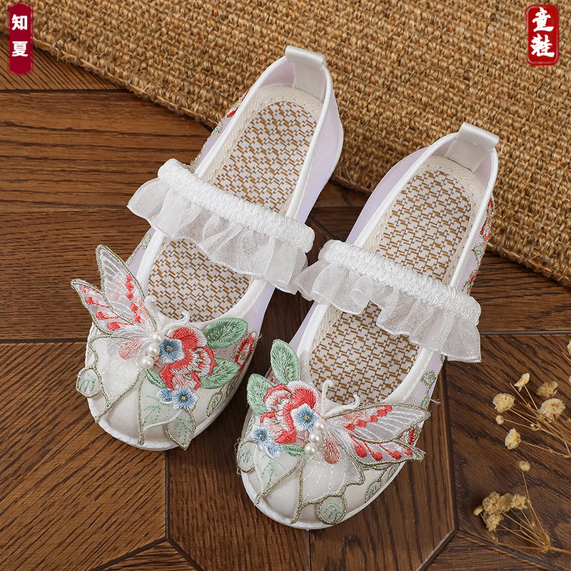 予舒単2025春夏の新型子供靴の女性時代の古風の平底刺繍靴と漢服靴