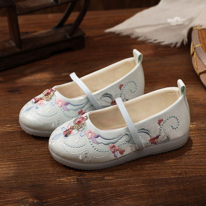 曼莹単2025春夏の新しい子供靴の女性の時代劇の古風の平底の刺繍の靴は漢服の靴を配合します。