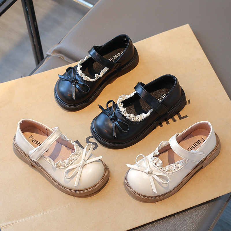 女の子の靴2025春秋の新型レースの蝶結びの王女の靴の学生は丸い頭の柔らかい底の靴を合わせます。