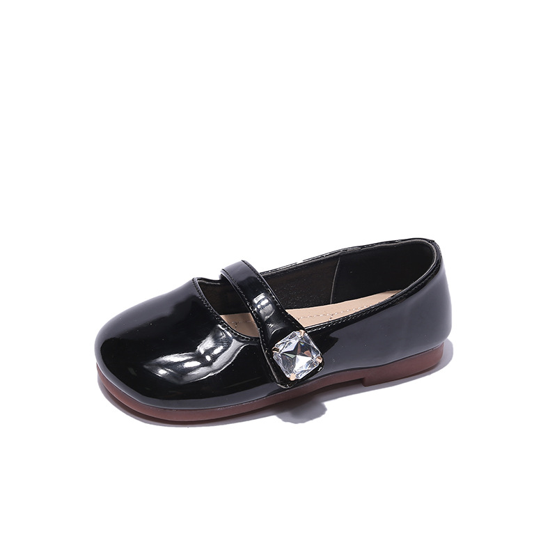 女の子用黒色パフォーマンスシューズ、中高生向け光沢シングルシューズ、マジックテープシューズ、海外向け子供靴卸売、プリンセス風