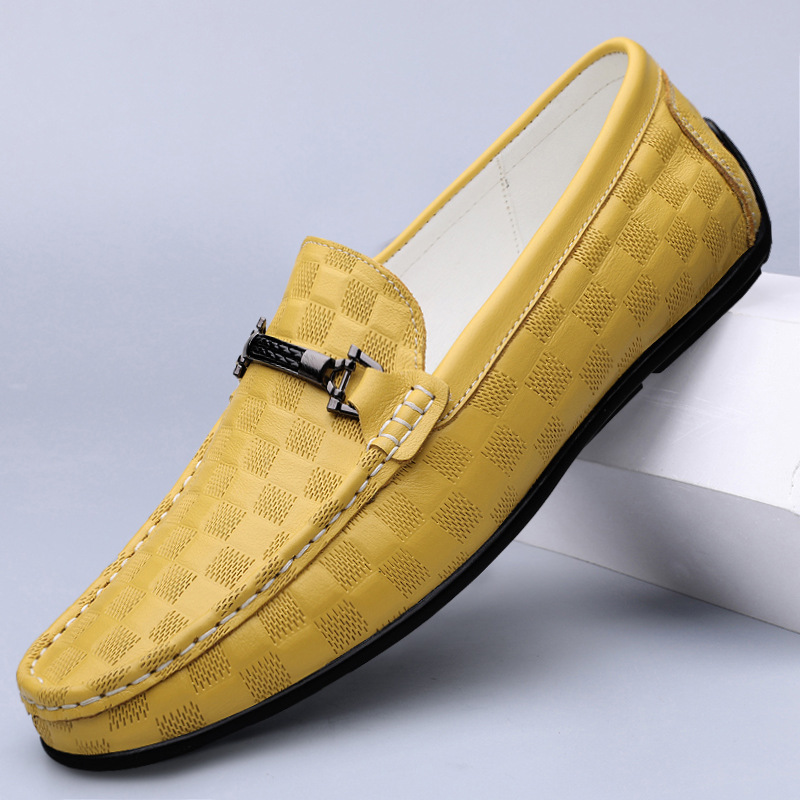 2025 メンズシューズ大きいサイズ通気性のあるトップレイヤーイエローカジュアルビーニーシューズ怠惰なソフトソールスリッポンドライビングローファー革靴
