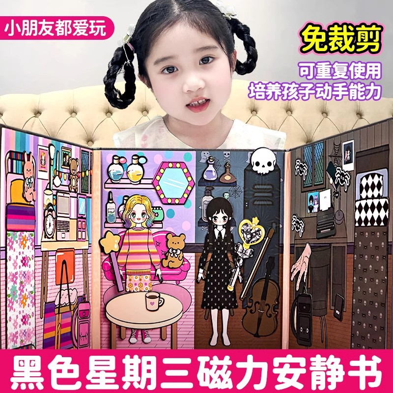 黒い水曜日とオオカミの女性の静かな本の新しい女の子はステッカーの王女を裁断して子供のおもちゃに着替えます。